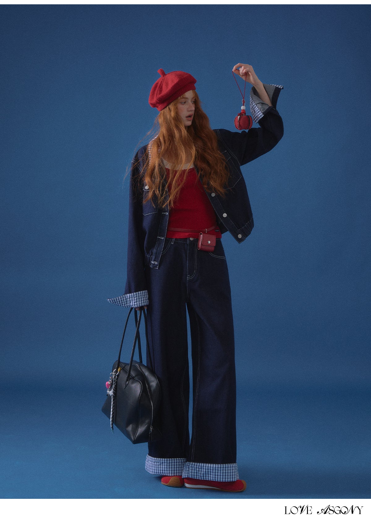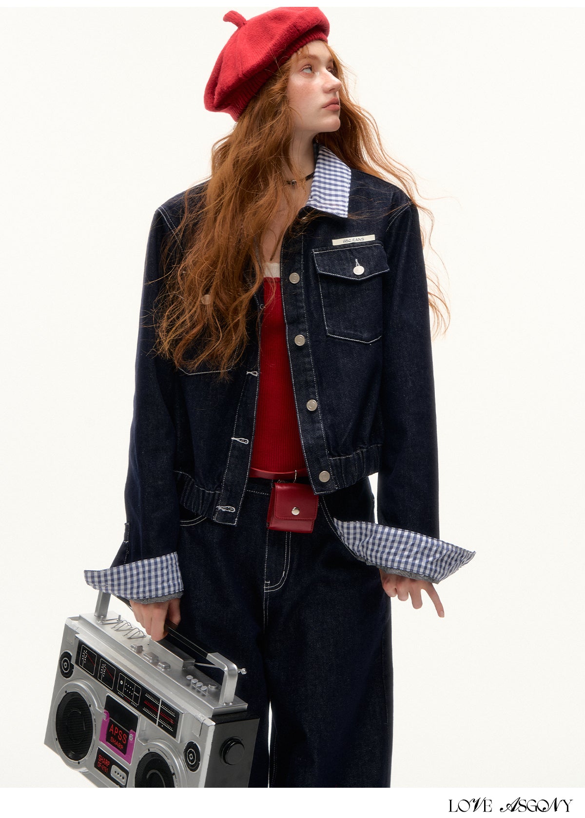 AsGony American Retro Hong Kong Style Plaid Denim Set | Raw Denim Jacket & Wide-Leg Pants Two-Piece