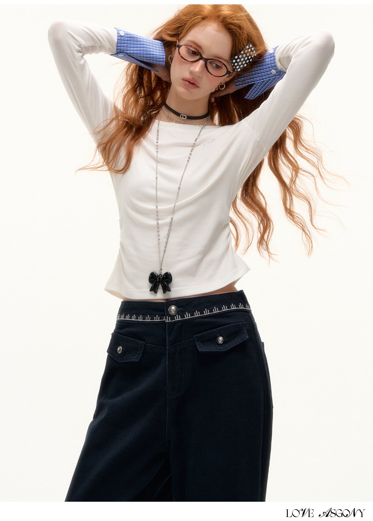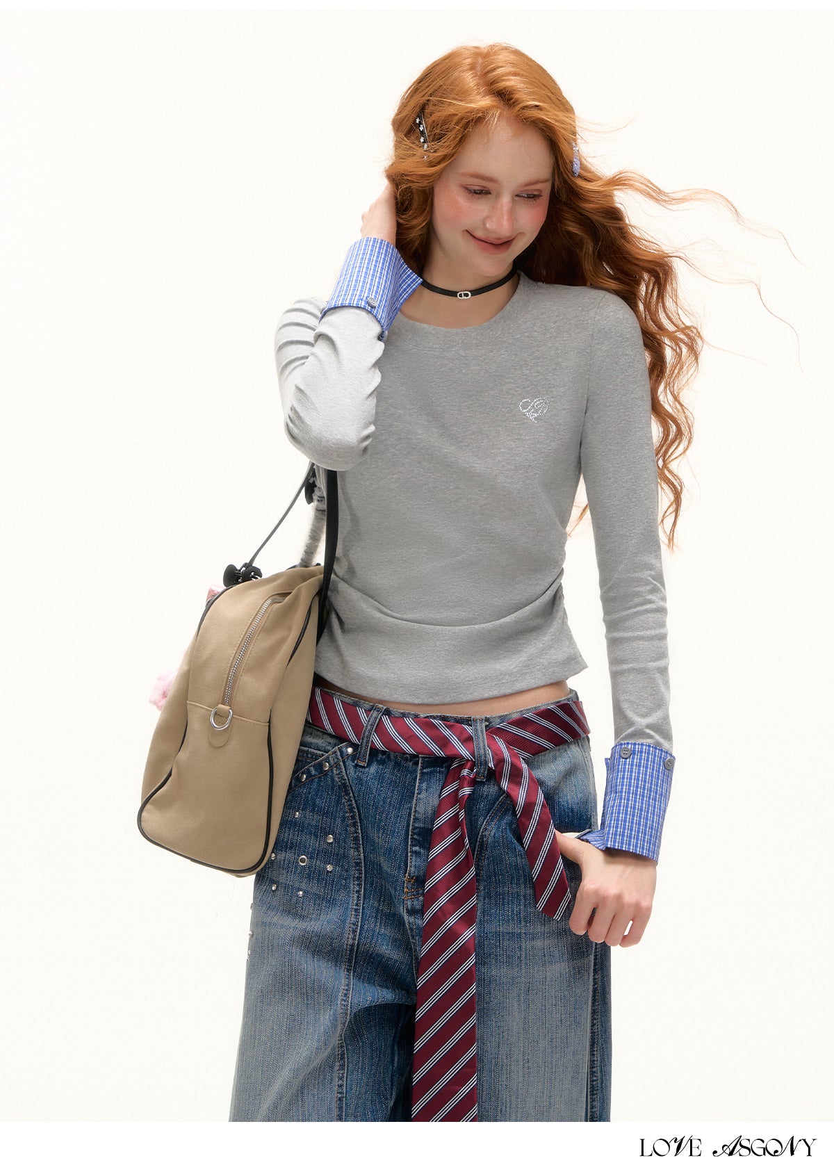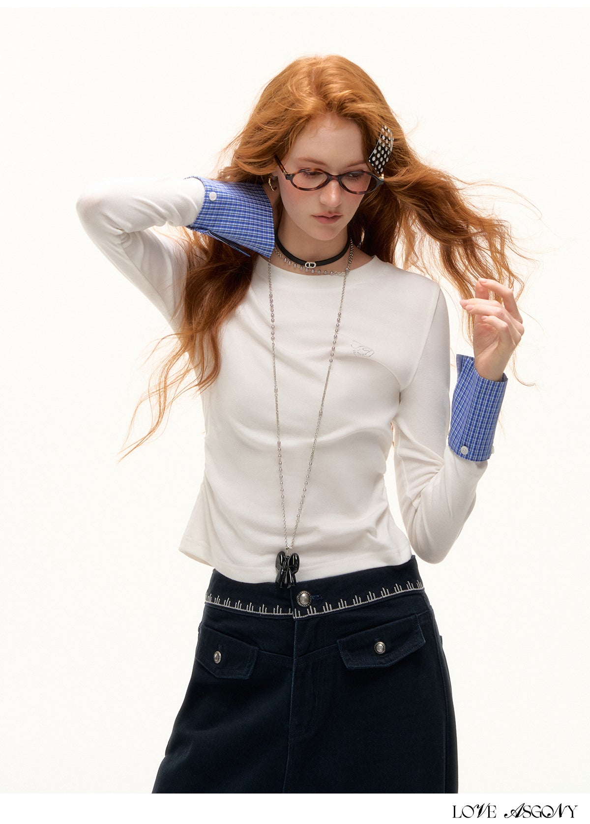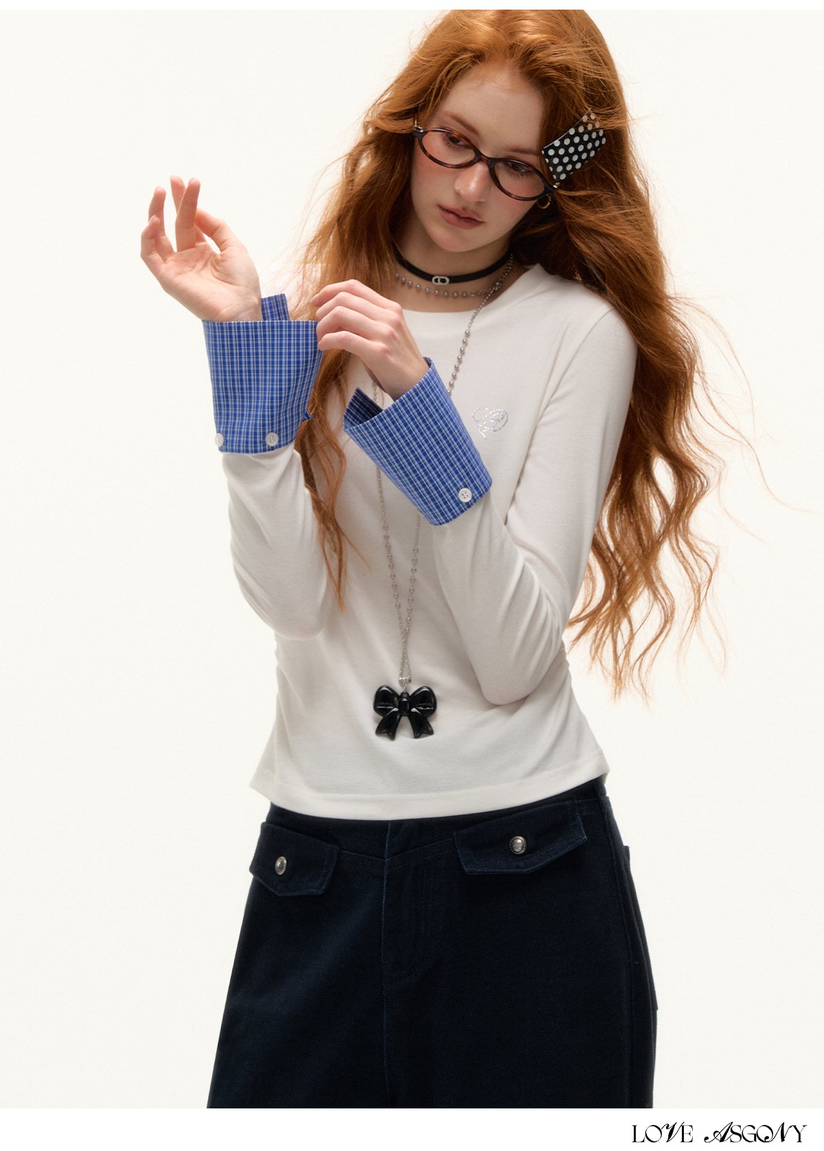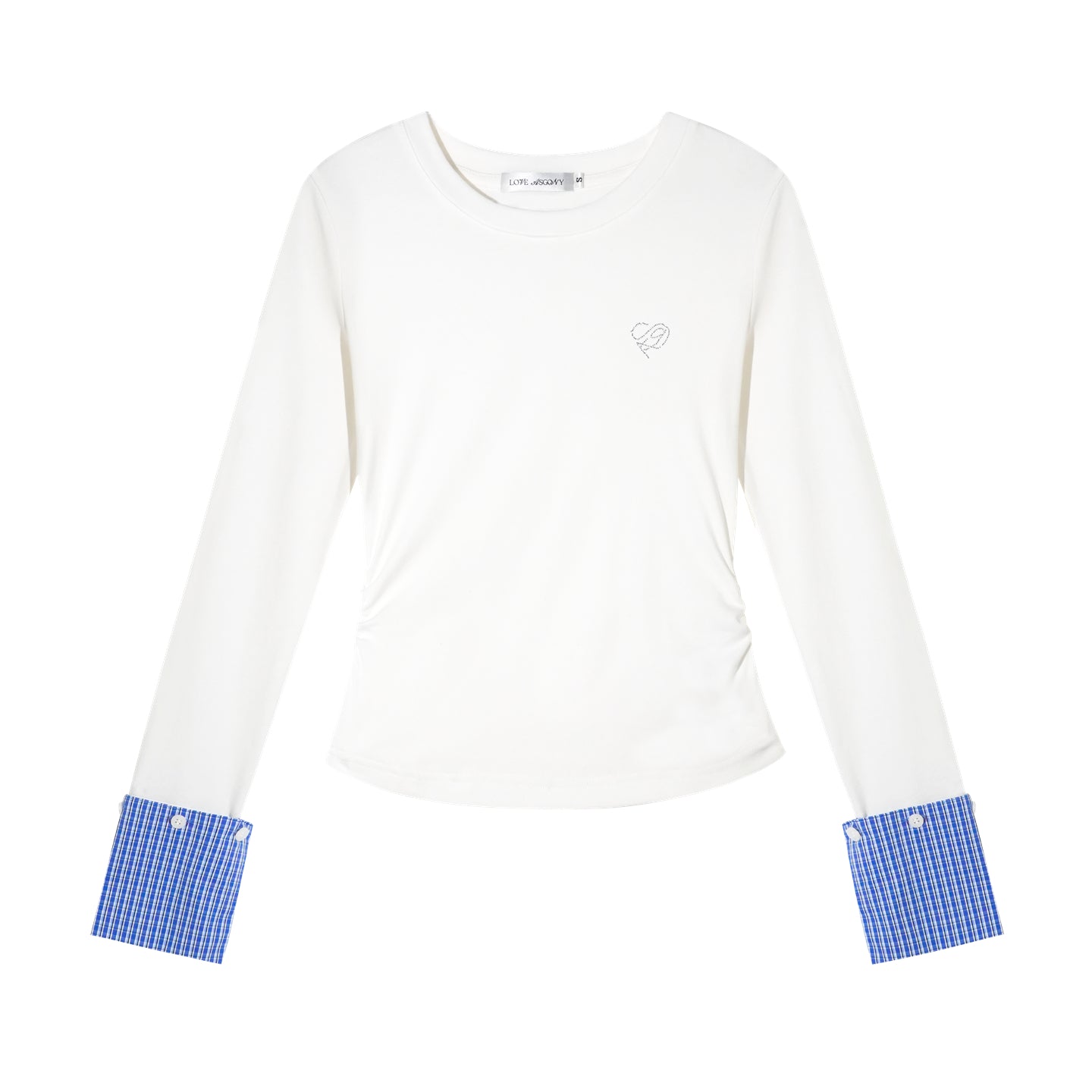 AsGony Detachable Cuff Plaid Long Sleeve T-Shirt