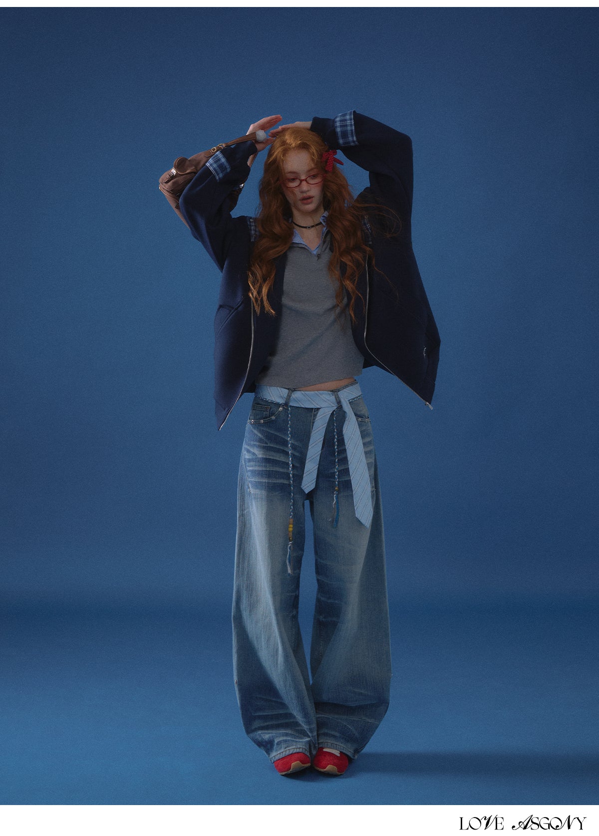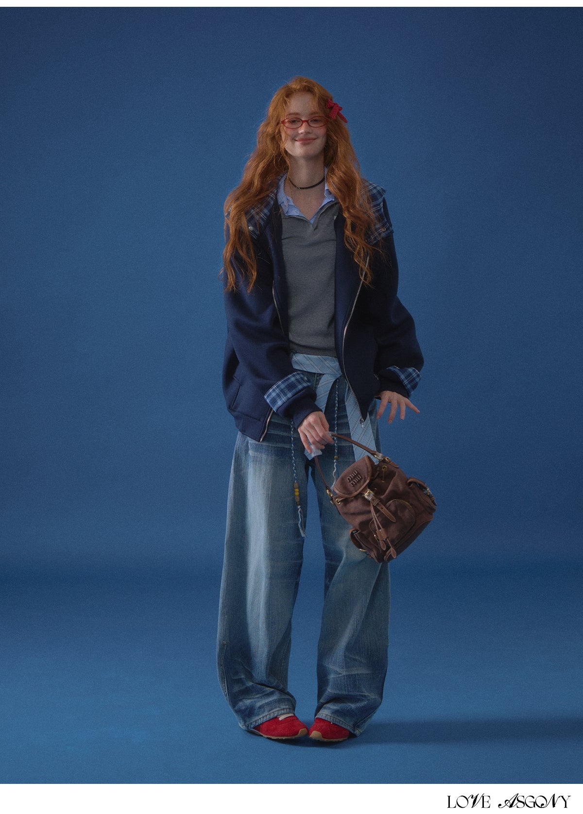 Features contrasting grey/navy plaid (patchwork), detailed embroidery, and a practical zip-front design.