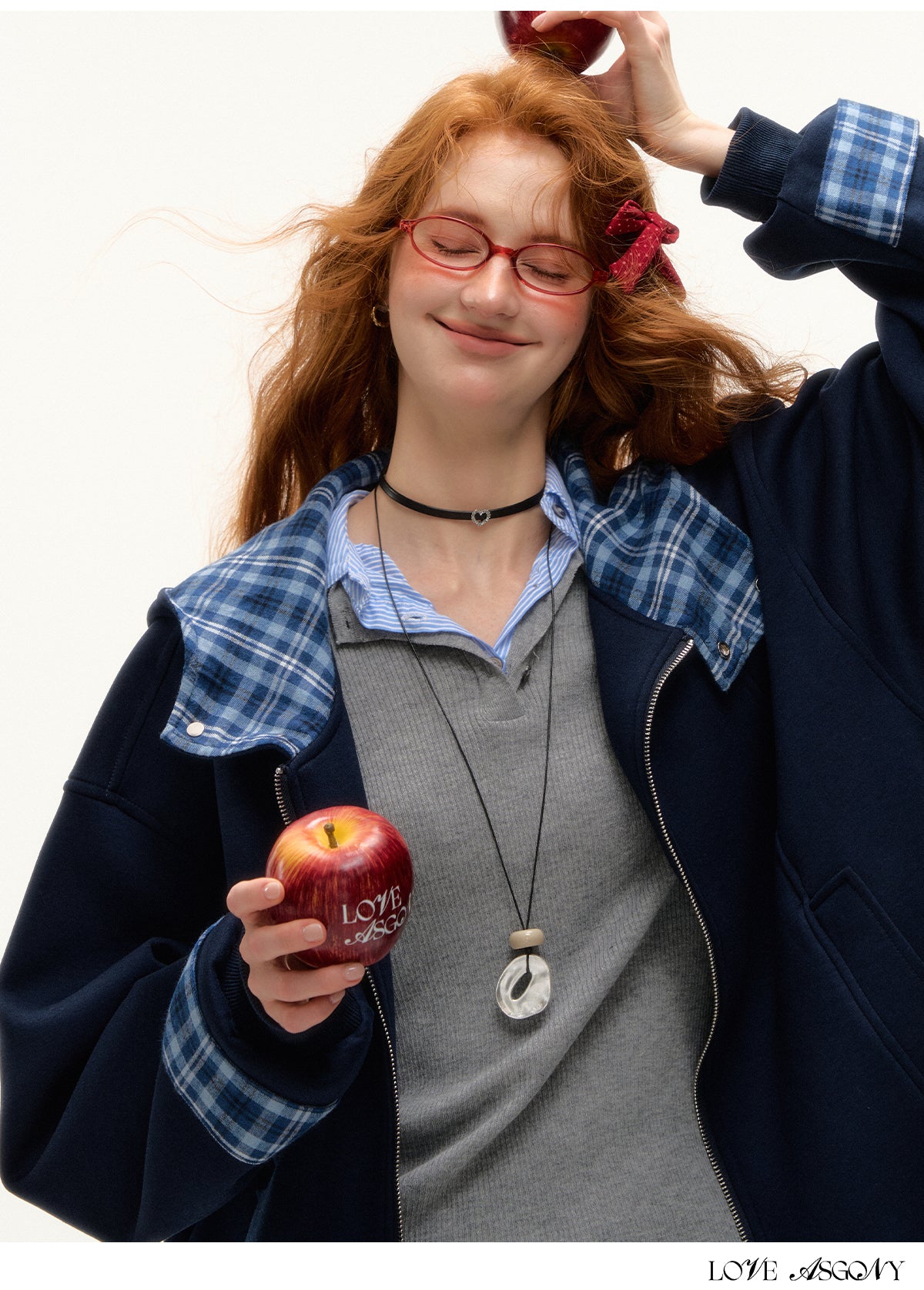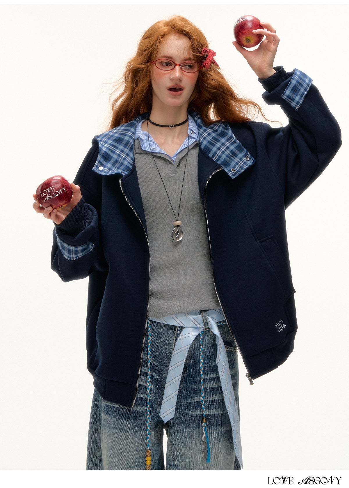 AsGony Plaid Panel Oversized Hooded Zip-Up | American Retro Embroidered Casual Jacket
