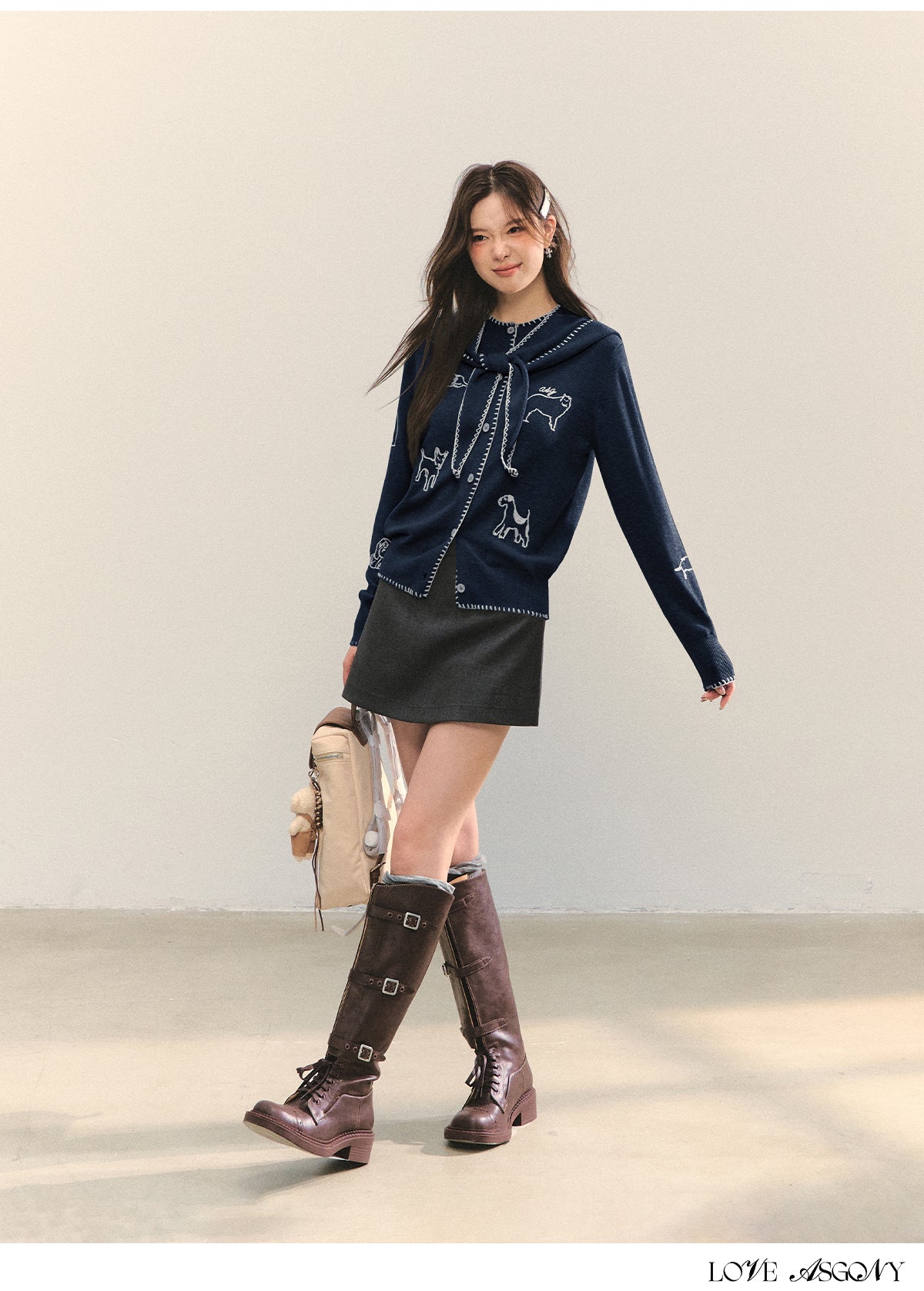 AsGony Puppy Embroidery Trim Hooded Knit Set