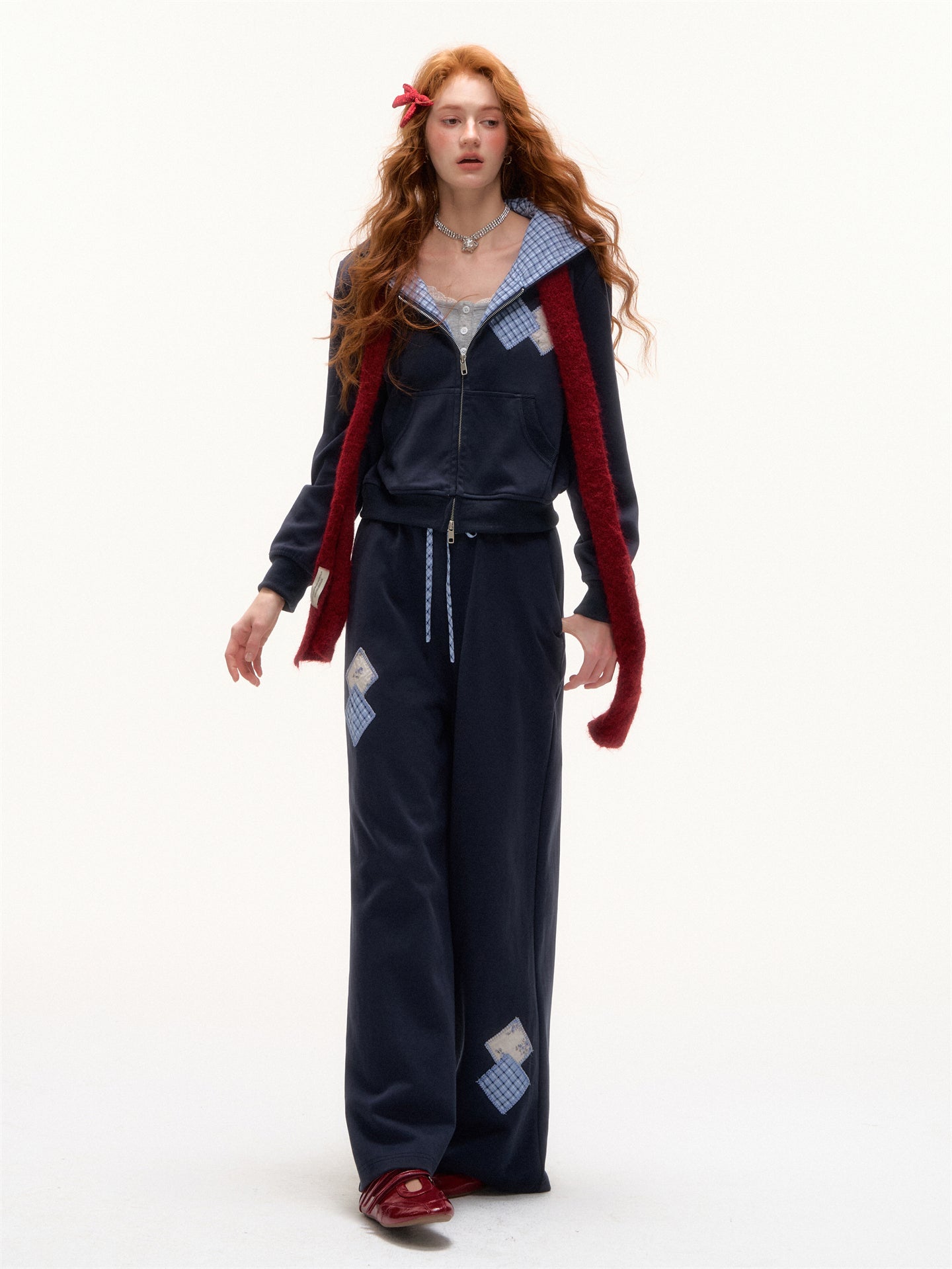 The set includes a slim-fit plaid sweatshirt with intricate patchwork embroidery and matching straight-leg joggers.