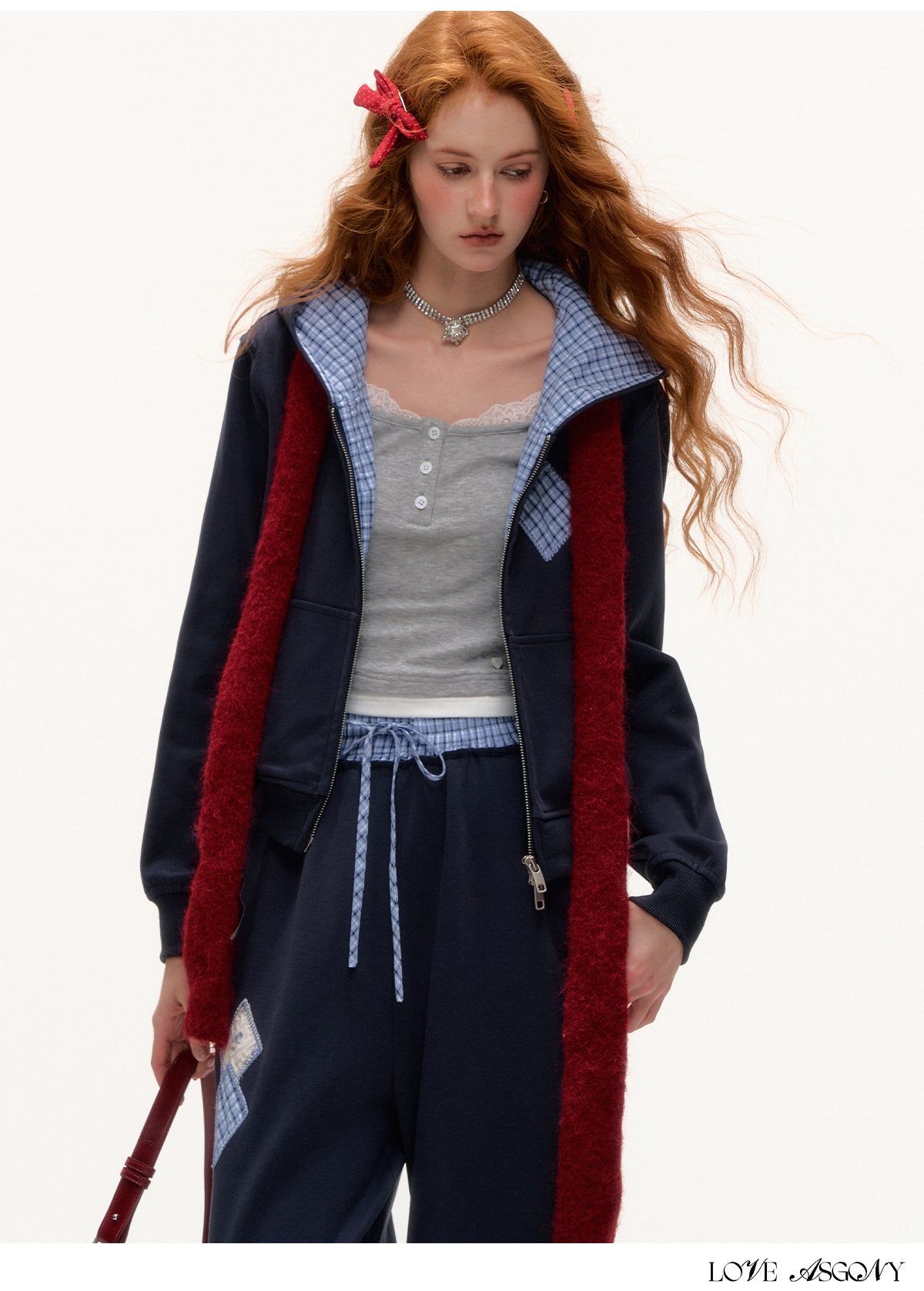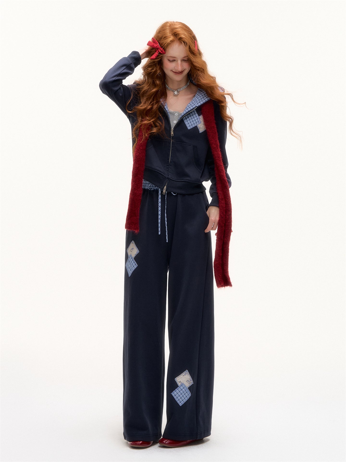 AsGony Retro Academic Style Slim Fit Plaid Patchwork Sweatshirt & Straight Leg Jogger Set