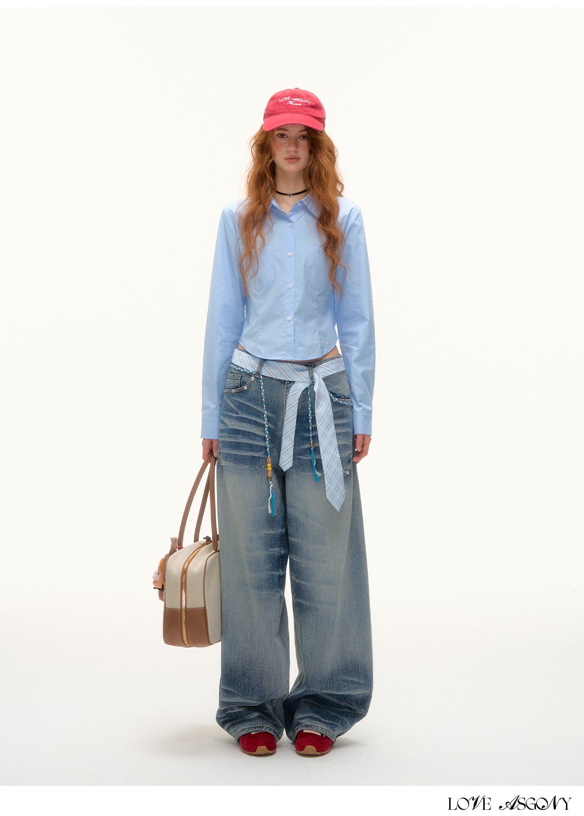 The versatile blue/white colorway and cropped length offer a modern, preppy aesthetic.