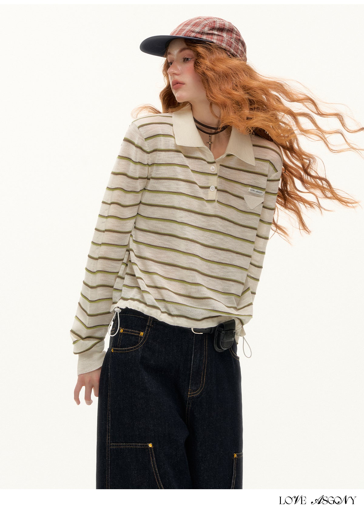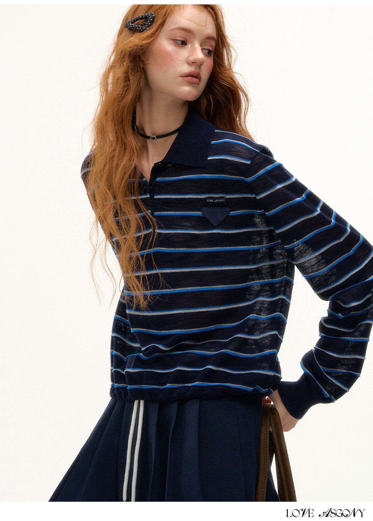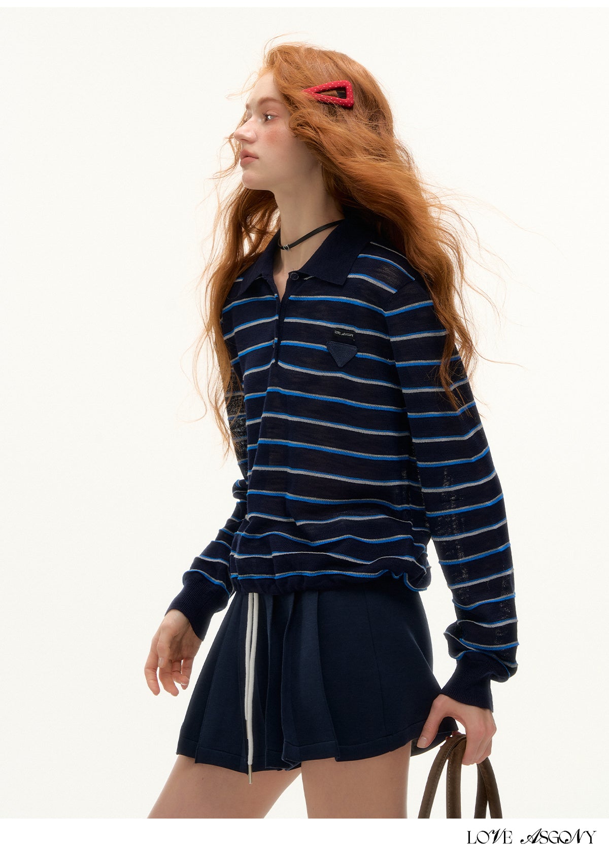AsGony Striped Polo Collar Drawstring Hem Knit Top