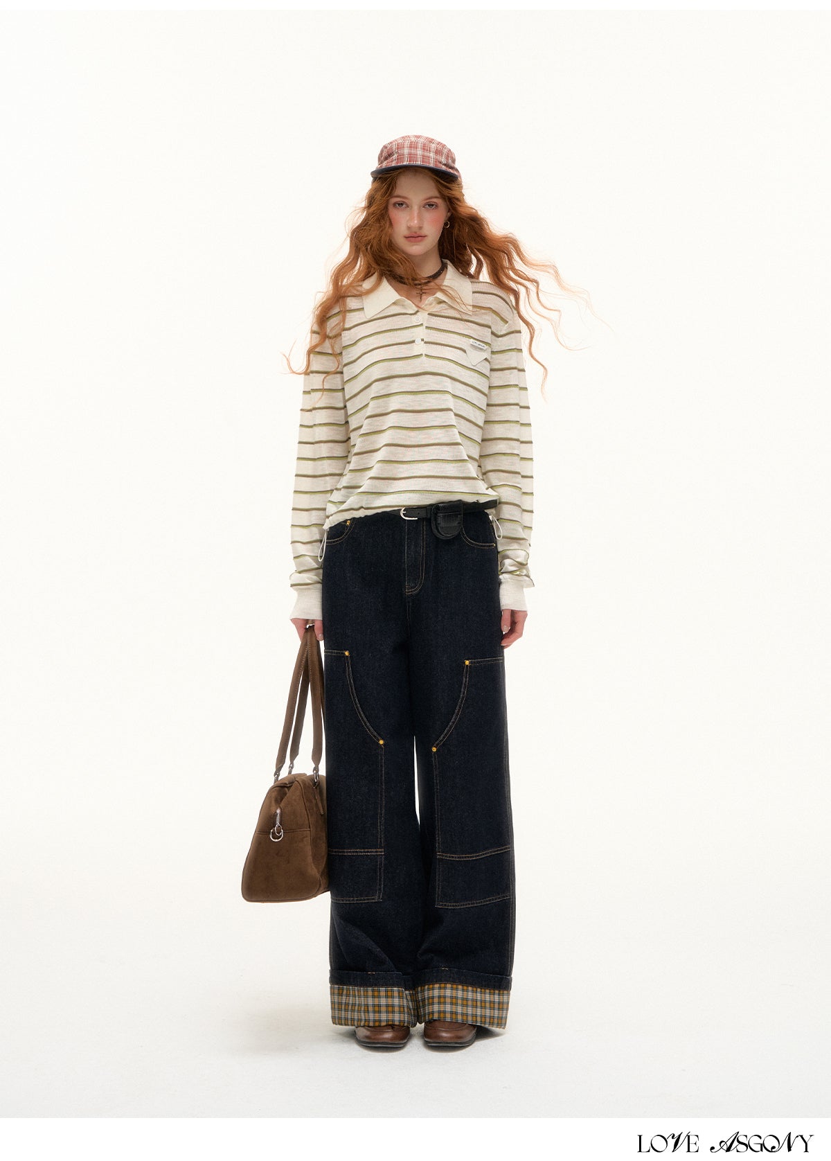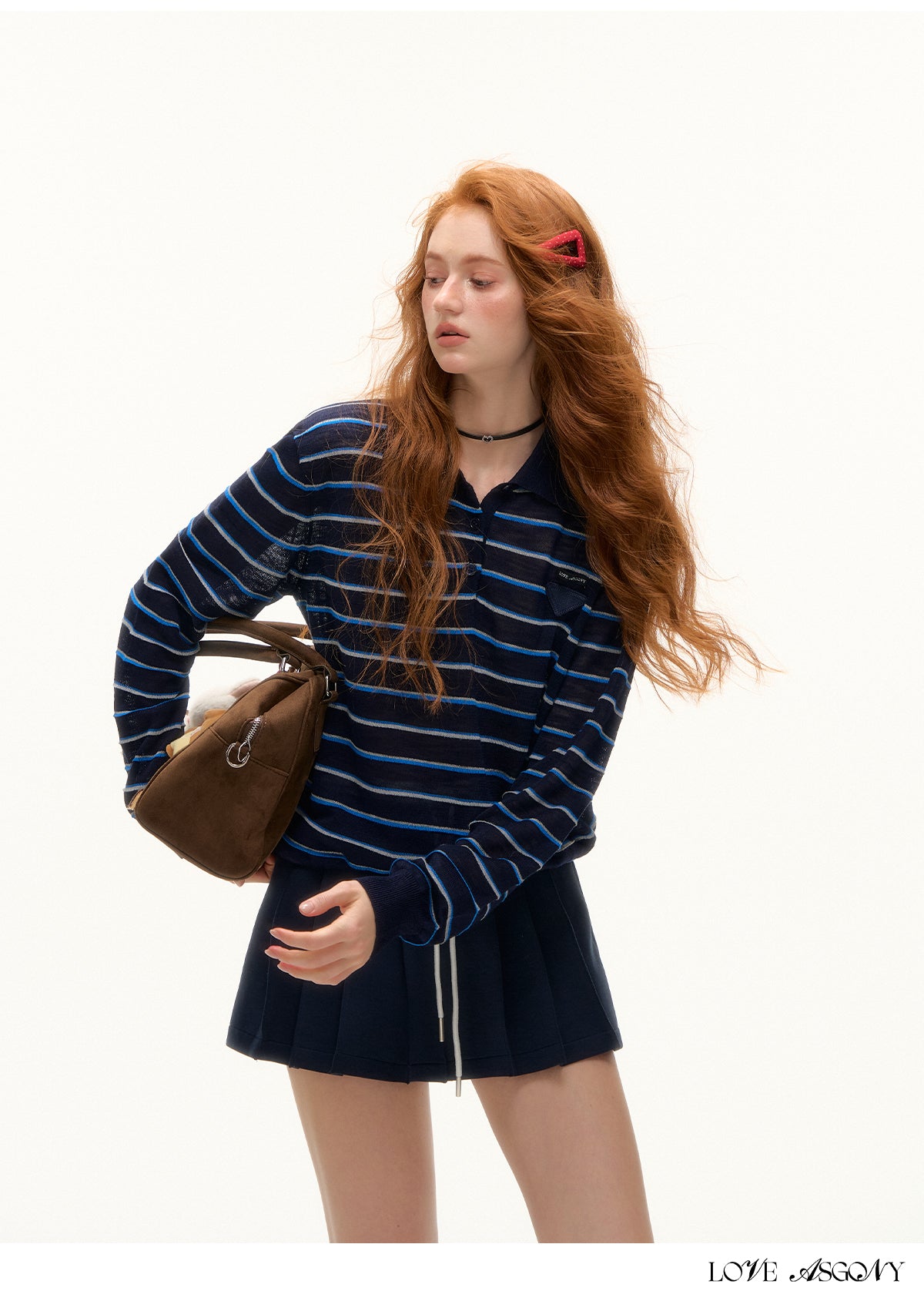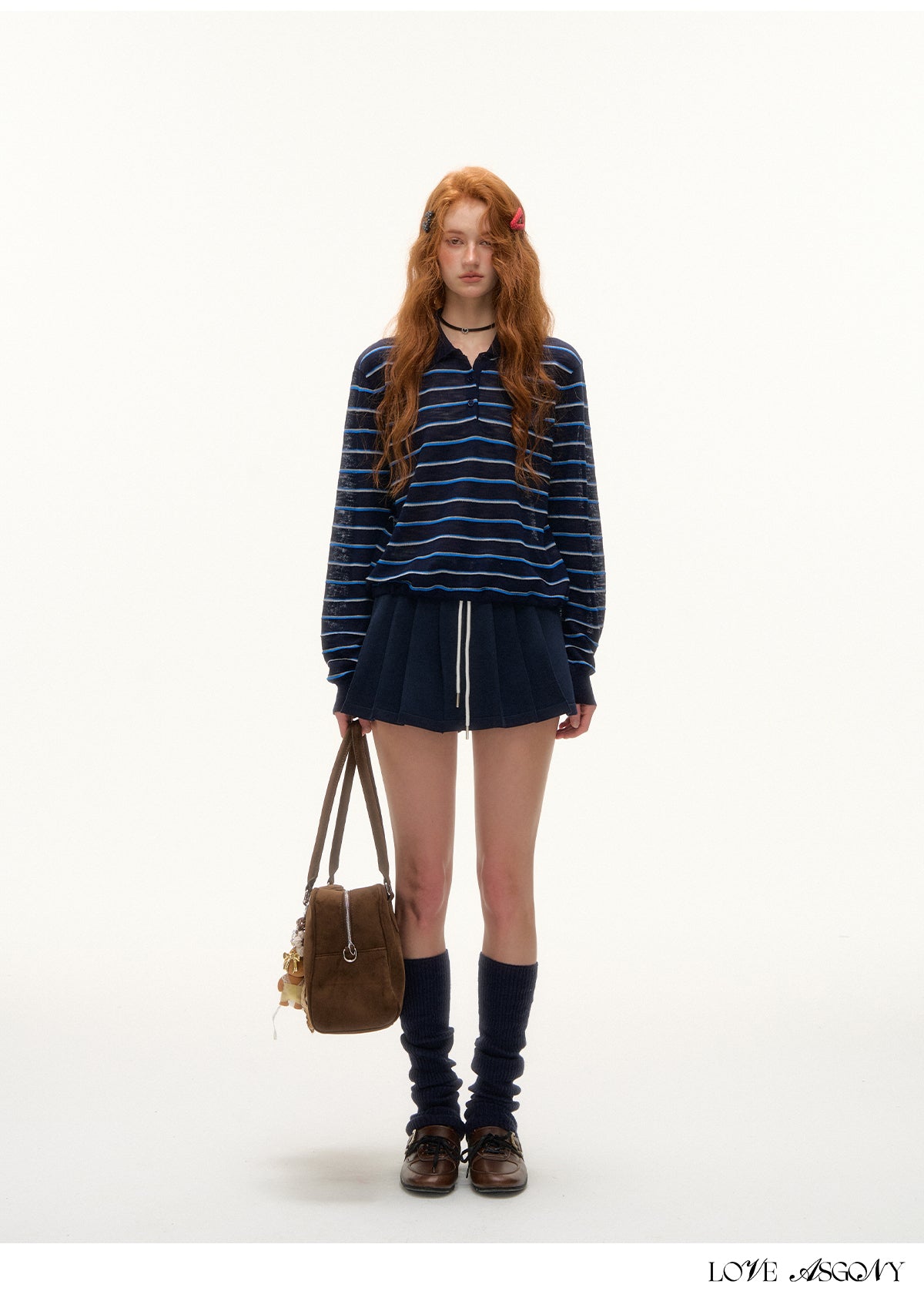 AsGony Striped Polo Collar Drawstring Hem Knit Top