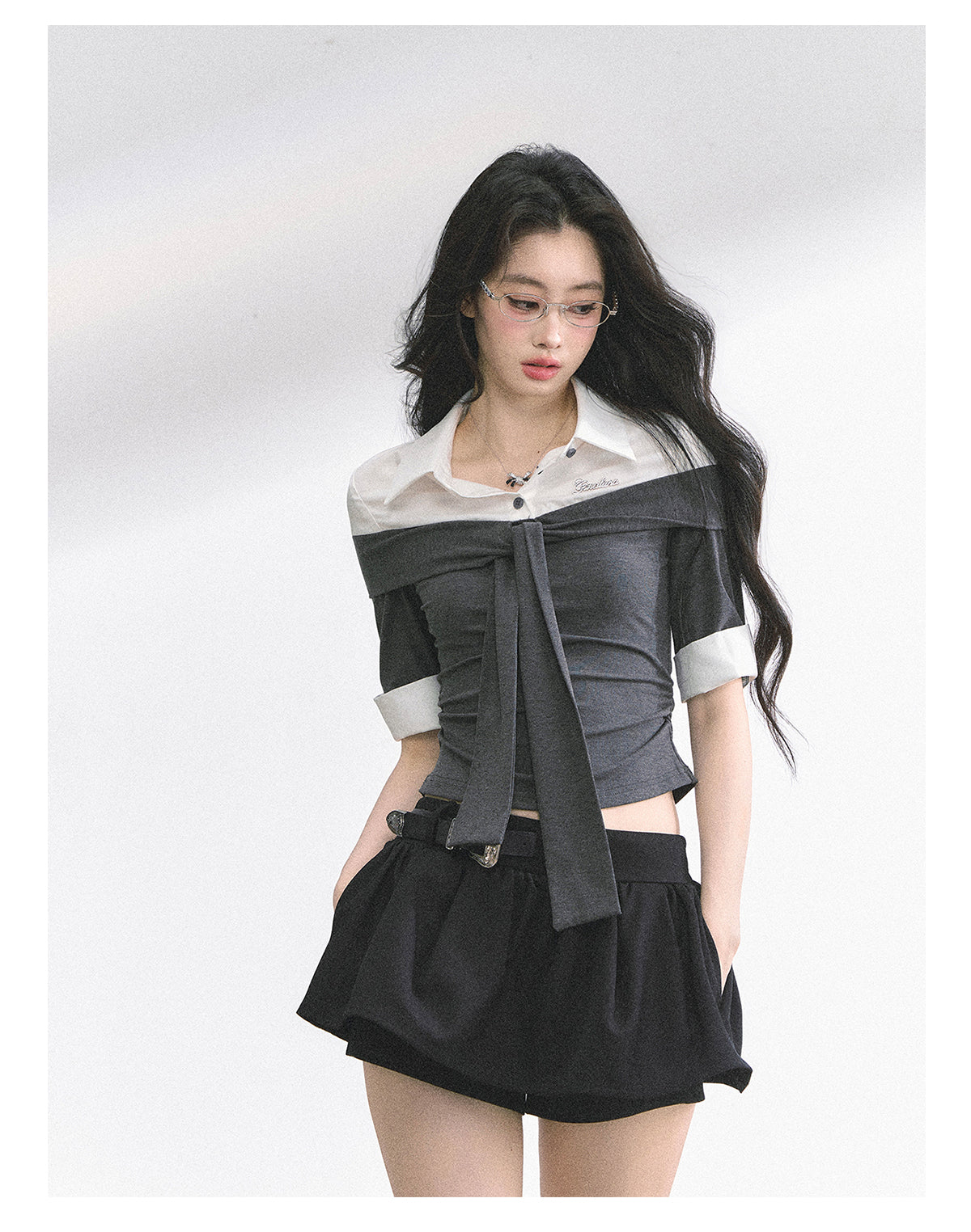 Design: Fashion-forward crop top with built-in layered look and cross motif