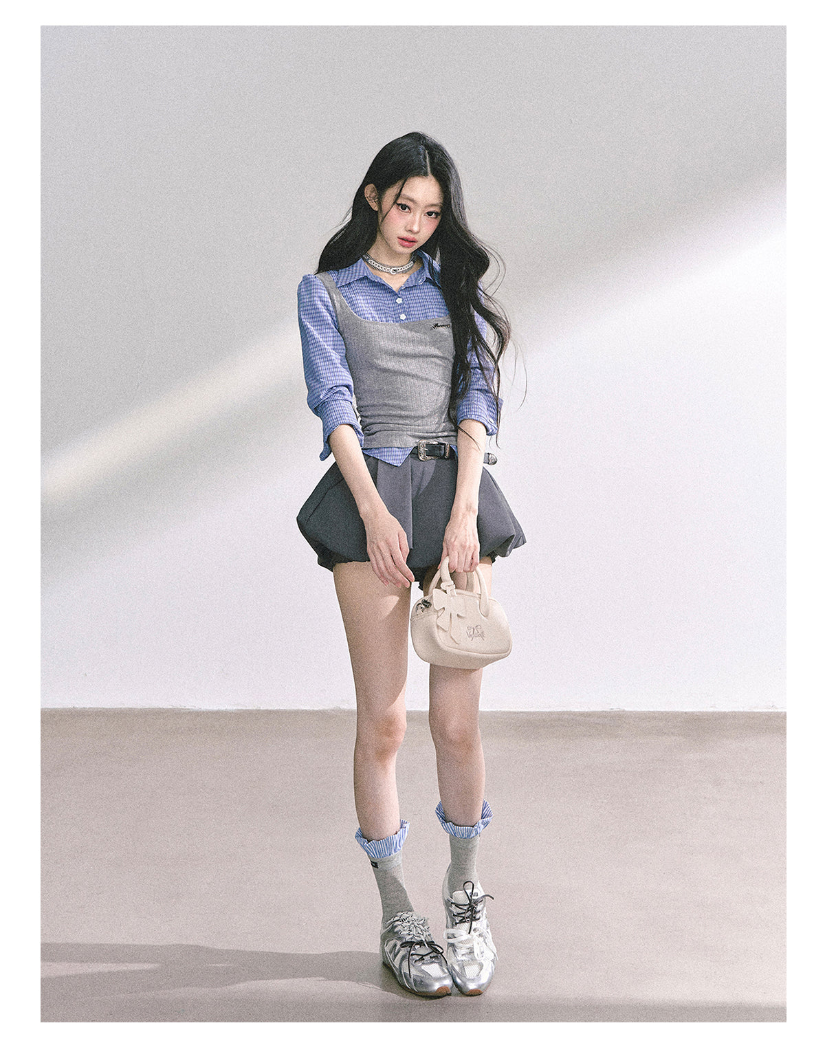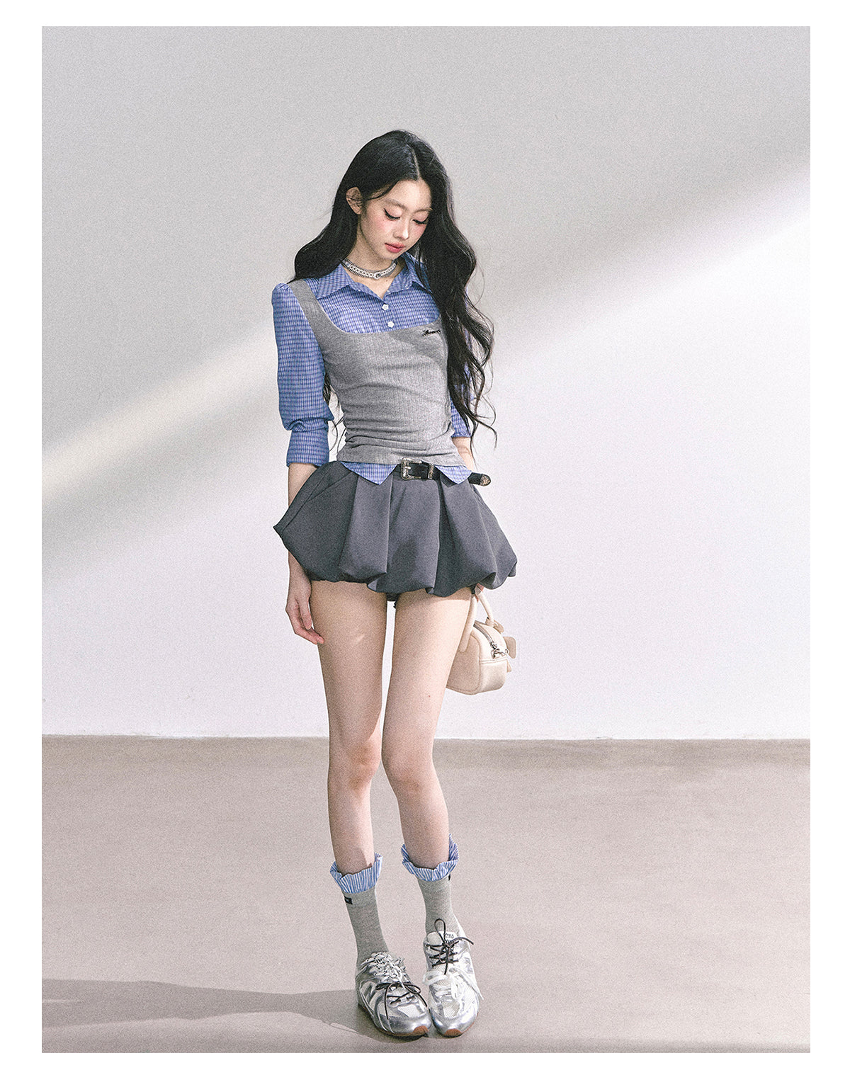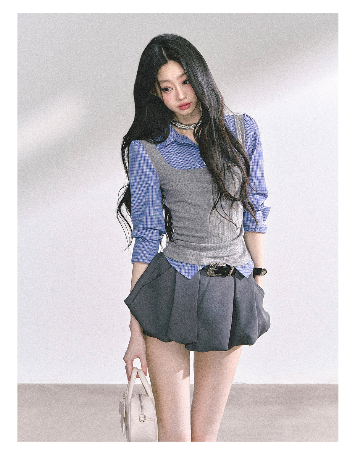 Design: Fashion-forward crop top with built-in layered look and classic plaid pattern