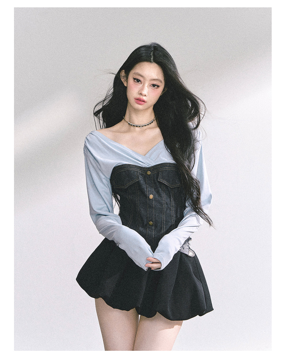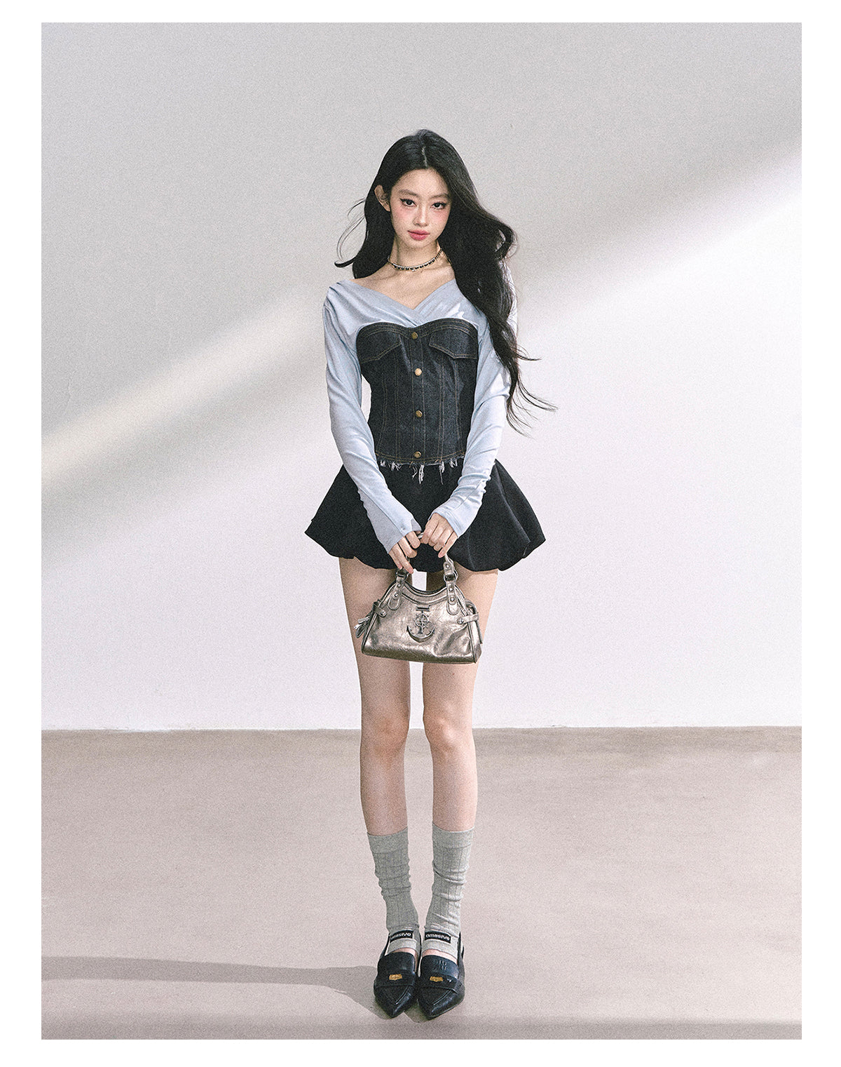 Design: Denim-inspired long sleeve top with deep V-neck and fitted crop silhouette