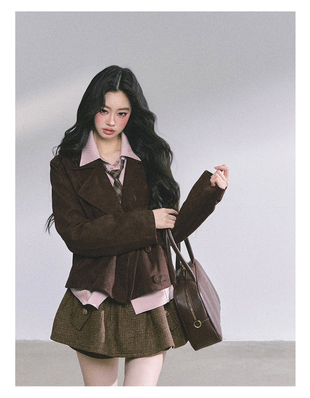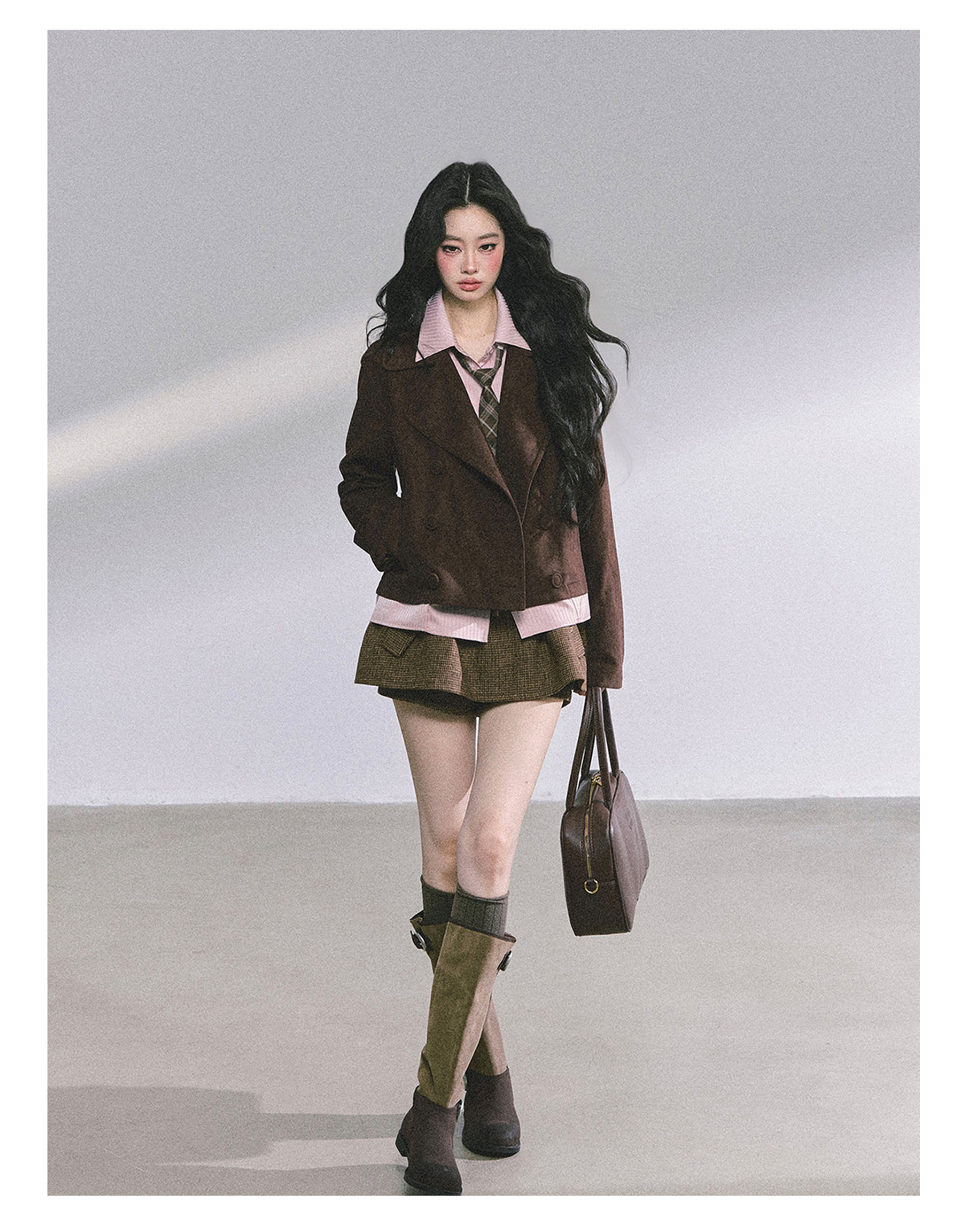 The versatile pink-beige color and cropped length create a chic silhouette for work, commute, or casual outings.