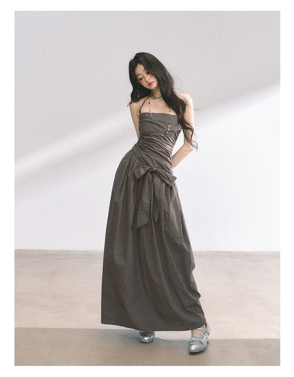 Design: Sleek halter-neck maxi dress with high waist and body-hugging silhouette. Available in gray and pink.
