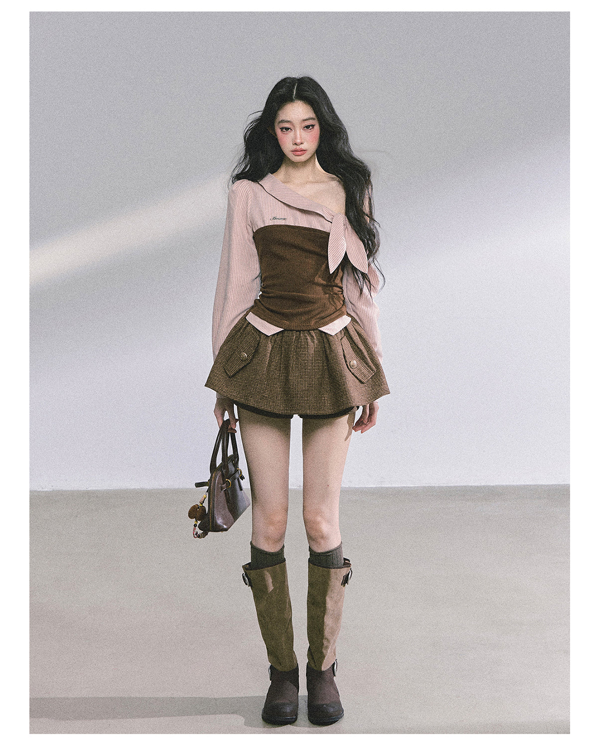 Capture the trendy Korean aesthetic with this stylish off-shoulder plaid T-shirt.