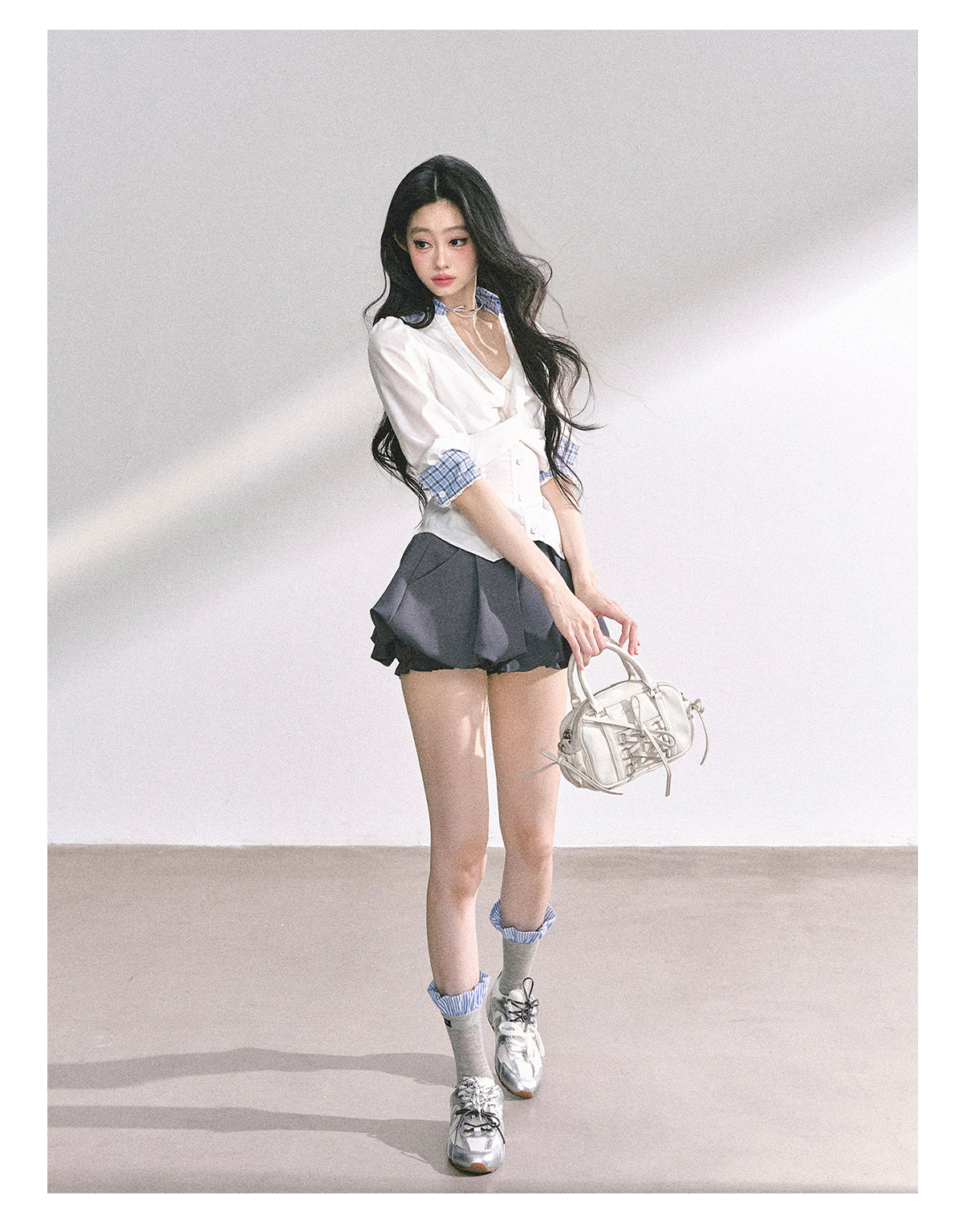 Design: Elegant V-neck blouse with waist-defining cut and minimalist detailing