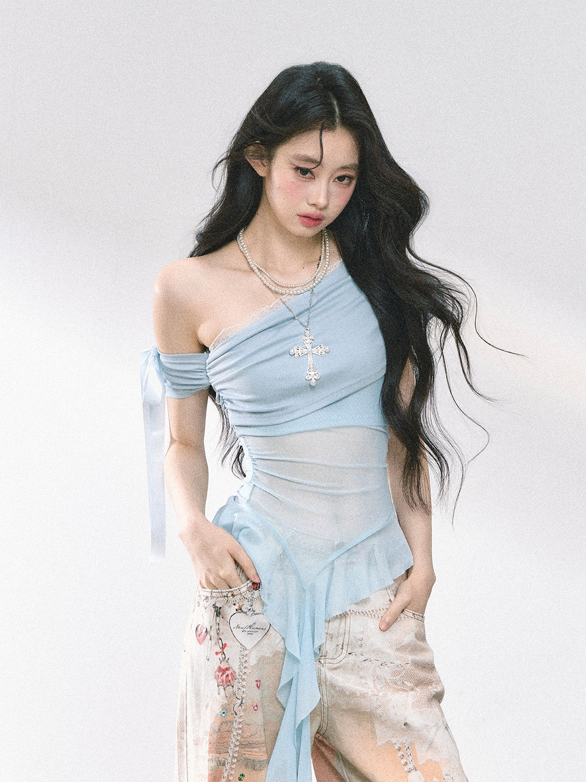 Design: Sheer mesh fabric with off-shoulder neckline
